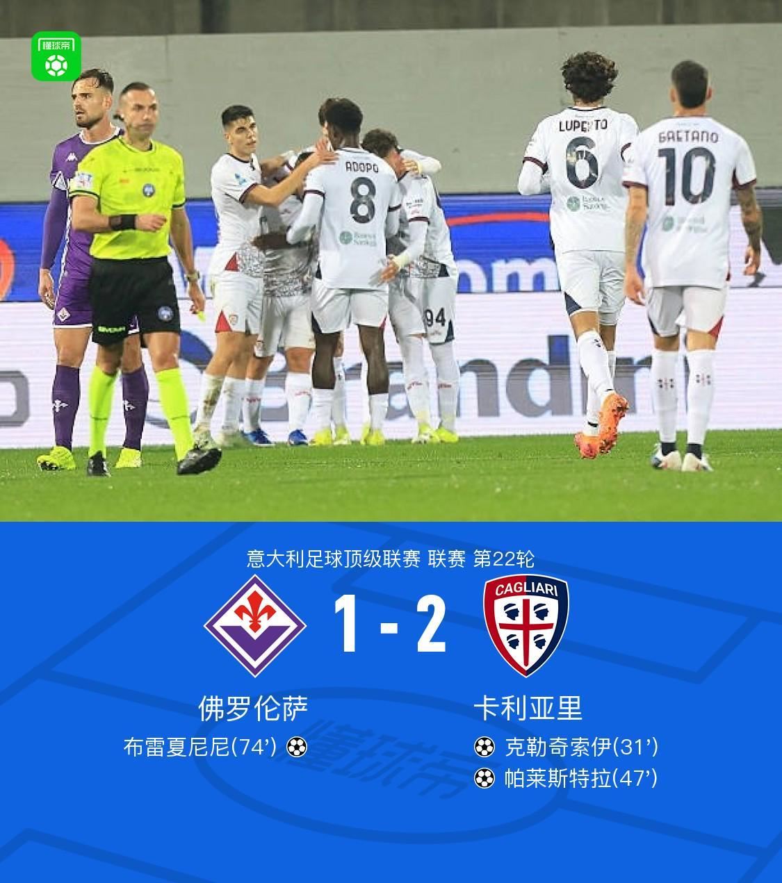 佛罗伦萨1-2卡利亚里,帕莱斯特拉传射建功,布雷夏尼尼破门