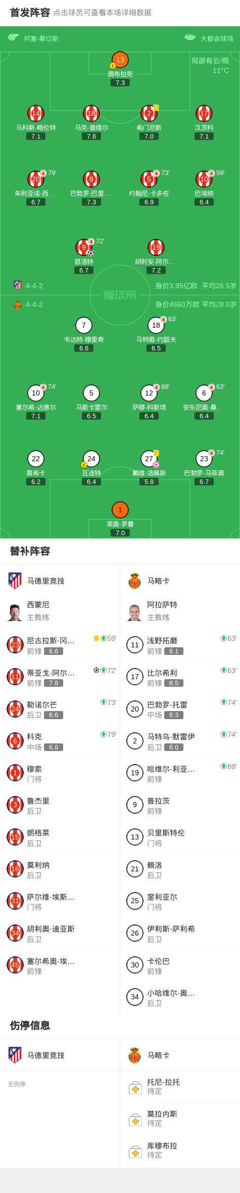马竞3-0马略卡联赛三连胜,略伦特造两球,瑟洛特补射破门